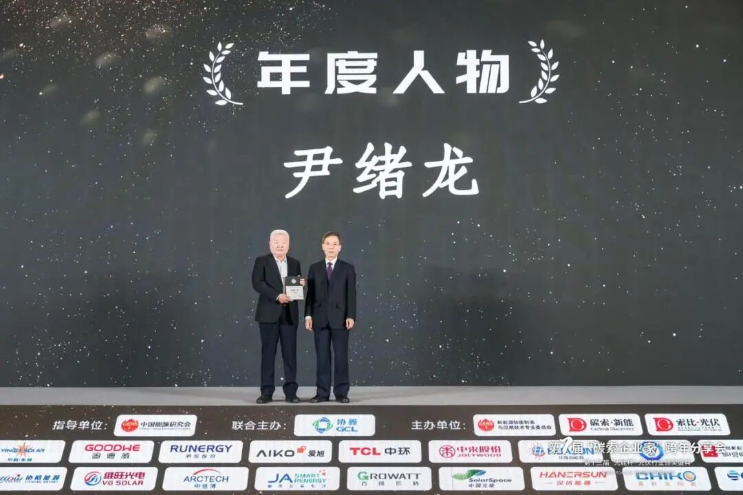 會議由中國能源研究會新能源智能制造與應用技術專委會、索比光伏網等主辦;中國能源研究會理事長史玉波,中國能源研究會可再生能源專委會主任委員梁志鵬等專家學者參會,中國能源研究會副理事長兼秘書長孫正運主持會議。會上,尹緒龍董事長榮膺光伏行業“年度人物”稱號,這既是對其過往貢獻的肯定,也是對MG不朽情緣近年來市場表現的高度認可。